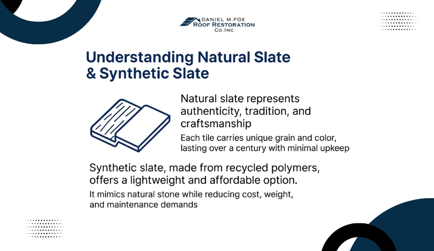 A Quick Answer: When comparing natural slate vs. synthetic slate for historic homes, the key difference lies in authenticity versus adaptability. Natural slate preserves the original architectural character and offers century-long durability. Synthetic slate provides a lightweight, affordable, and low-maintenance alternative that visually mimics the real stone. |