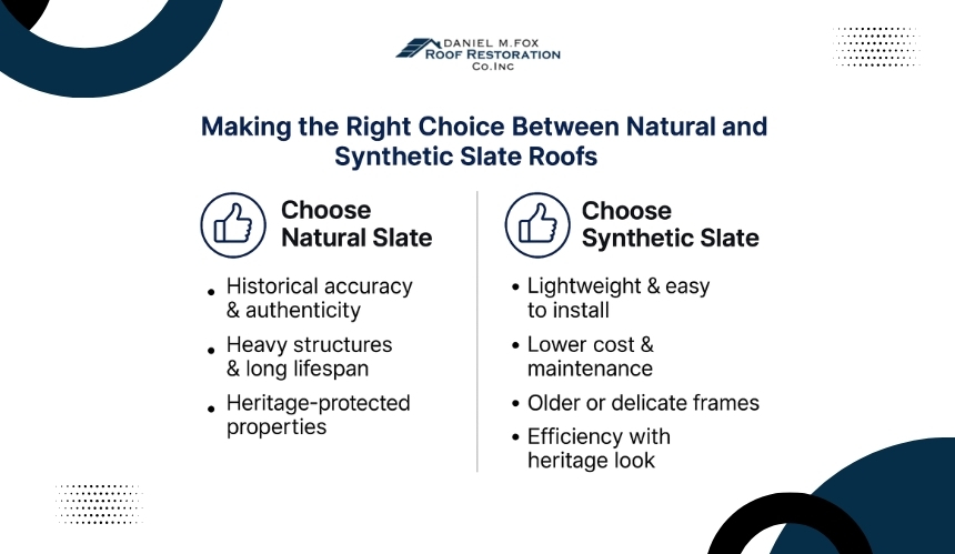Restoring a historic home requires a roofing choice that respects both its heritage and structure. The decision between natural slate and synthetic slate depends on whether authenticity, weight, cost, or maintenance is the main priority. Here’s a clear guide to help homeowners decide which option best fits their restoration goals:
