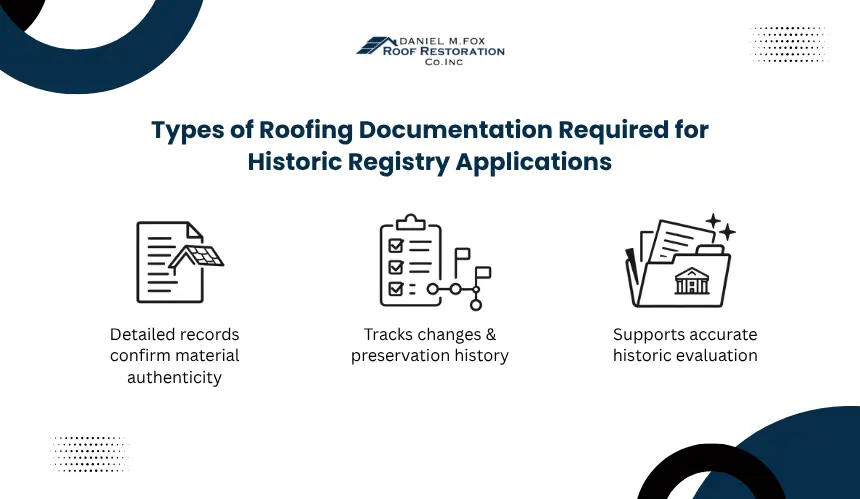 Material records help reviewers determine whether the current roof matches the building’s original construction period. These documents may include manufacturer information, historic invoices, quarry sources for slate, species identification for cedar, or archival notes about early metalwork.